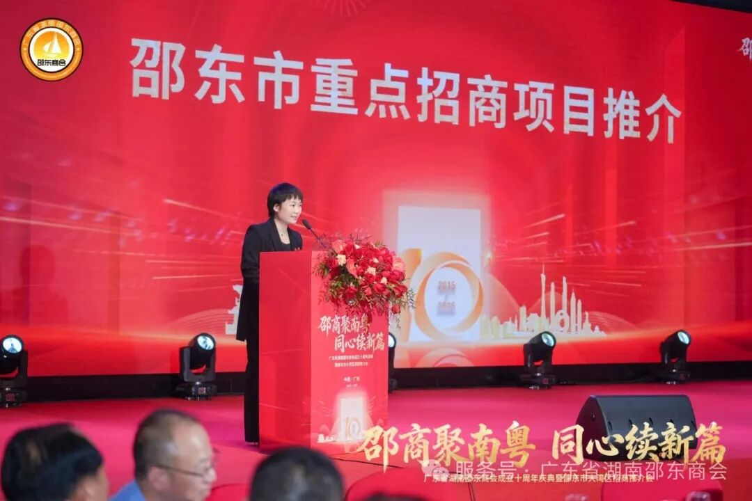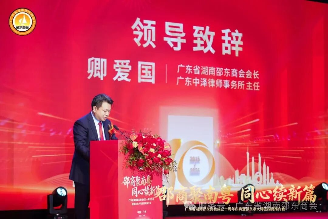 庆典仪式上,广东省湖南邵东商会会长卿爱国先生发表了热情洋溢的致辞。他满怀深情地回顾了商会十年的发展征程,从初创时的筚路蓝缕,到如今的蓬勃壮大,每一步都离不开全体会员的同心同德、离不开各级领导的关心支持、离不开商界挚友的鼎力相助。他细数商会在凝聚会员力量、维护会员权益、搭建政企沟通桥梁、推动粤邵两地经贸交流、投身公益慈善事业等方面取得的丰硕成果,字里行间满是自豪与感慨。