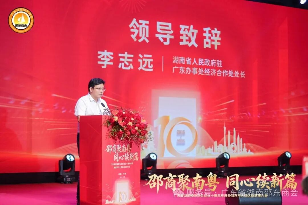 湖南省人民政府驻广东办事处经济合作处处长李志远对商会十年来的工作给予高度评价与充分肯定。他指出,广东省湖南邵东商会自成立以来,始终牢记使命担当,充分发挥桥梁纽带作用,在凝聚湘商力量、促进粤湘两地经贸交流合作、助力家乡招商引资等方面作出了积极而卓越的贡献。他希望商会未来能继续发挥平台优势,进一步加强与各级政府、兄弟商会的交流协作,推动更多优质资源精准对接,为粤湘两地协同发展注入更强动力。